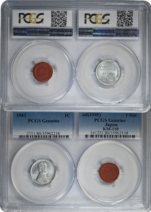 1943 Steel Lincoln Wheat Cent 1C & nd(1945) Japan 1 Sen KM-110 PCGS Genuine