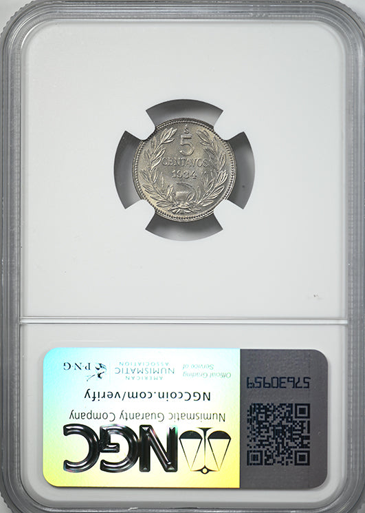1934 SO Chile 5C Centavos NGC MS67 - TOP POP!
