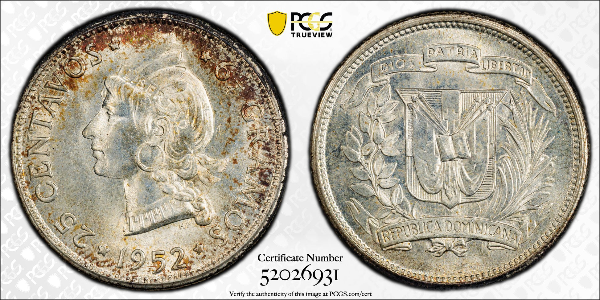 1952 Dominican Republic 25C Centavos PCGS MS66
