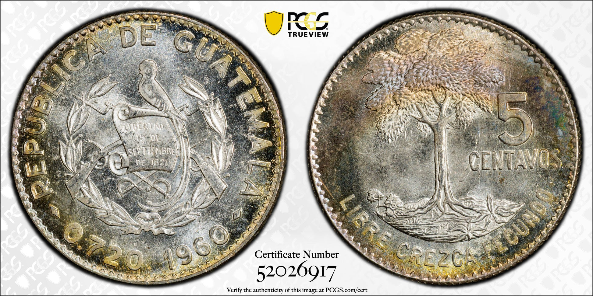 1960 Guatemala 5C Centavos PCGS MS66 - TONED!