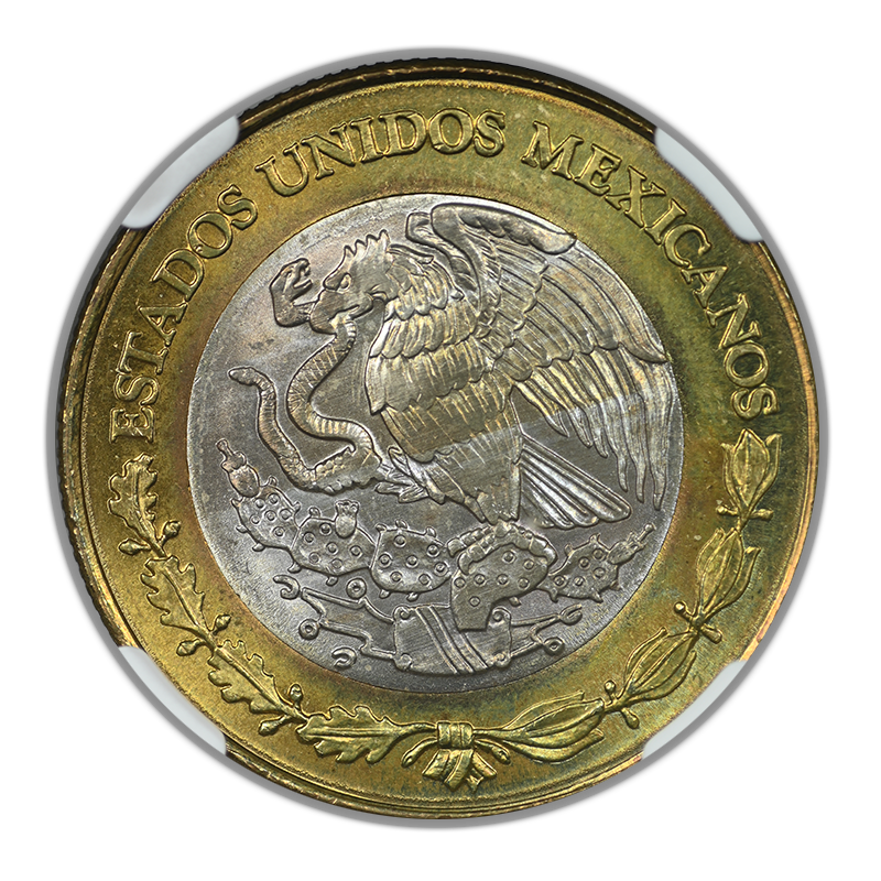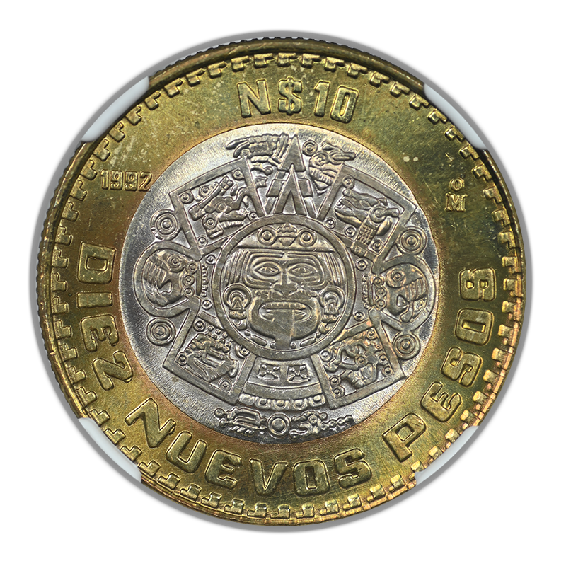 1992 Mo Mexico 10P Nuevo Pesos Estados Unidos Mexicano Bimetallic Ag Center-AI Bronze Ring NGC MS65